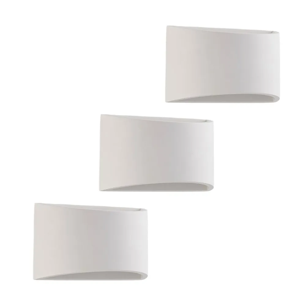 Heiko – hvid gips væglampe i praktisk 3-pak Denne væglampe udsender lys opad og nedad på en effektiv og frem for alt hyggelig måde. Selve lampekroppen har en halvcirkelformet form, som opfattes som tiltalende og attraktiv og kan kombineres med en række stilarter. Hvis du gerne vil matche væglampens farve, kan du trygt gribe til penslen, da gipsarmaturer er meget nemme at male over. Heiko fås her som et sæt med 3 stk.