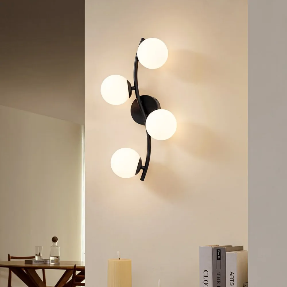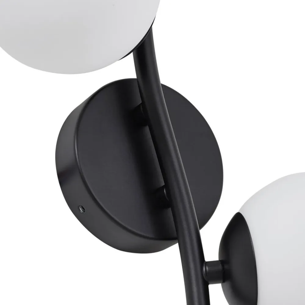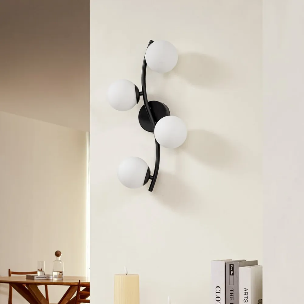 Væglampe Josiana kombinerer opal glas med en elegant sort finish og passer perfekt ind i moderne stuer og spisestuer. Samspillet mellem glas og metal giver lampen en tidløs æstetik, der imponerer i både minimalistiske og mere krævende indretningsstilarter. Den harmoniske farve i hvid og sort skaber en stilfuld atmosfære og understreger lampens alsidighed.