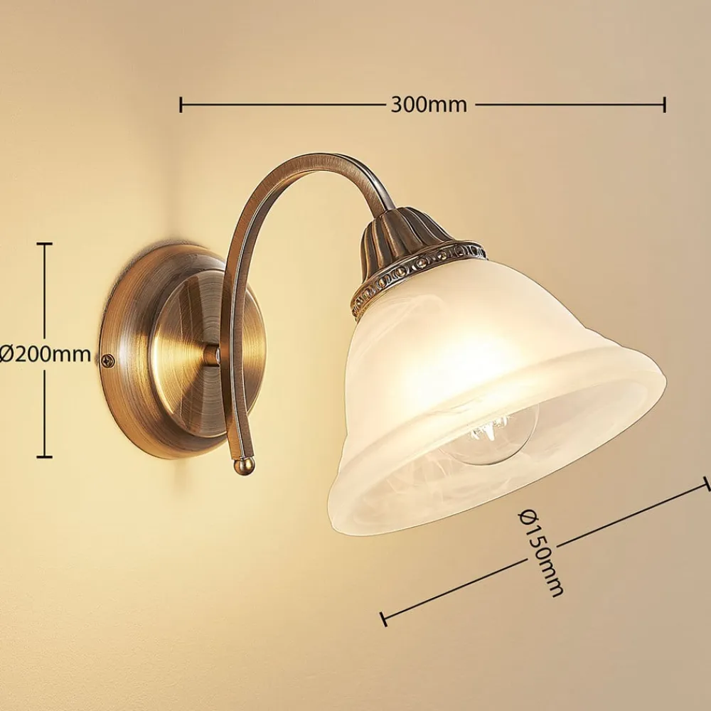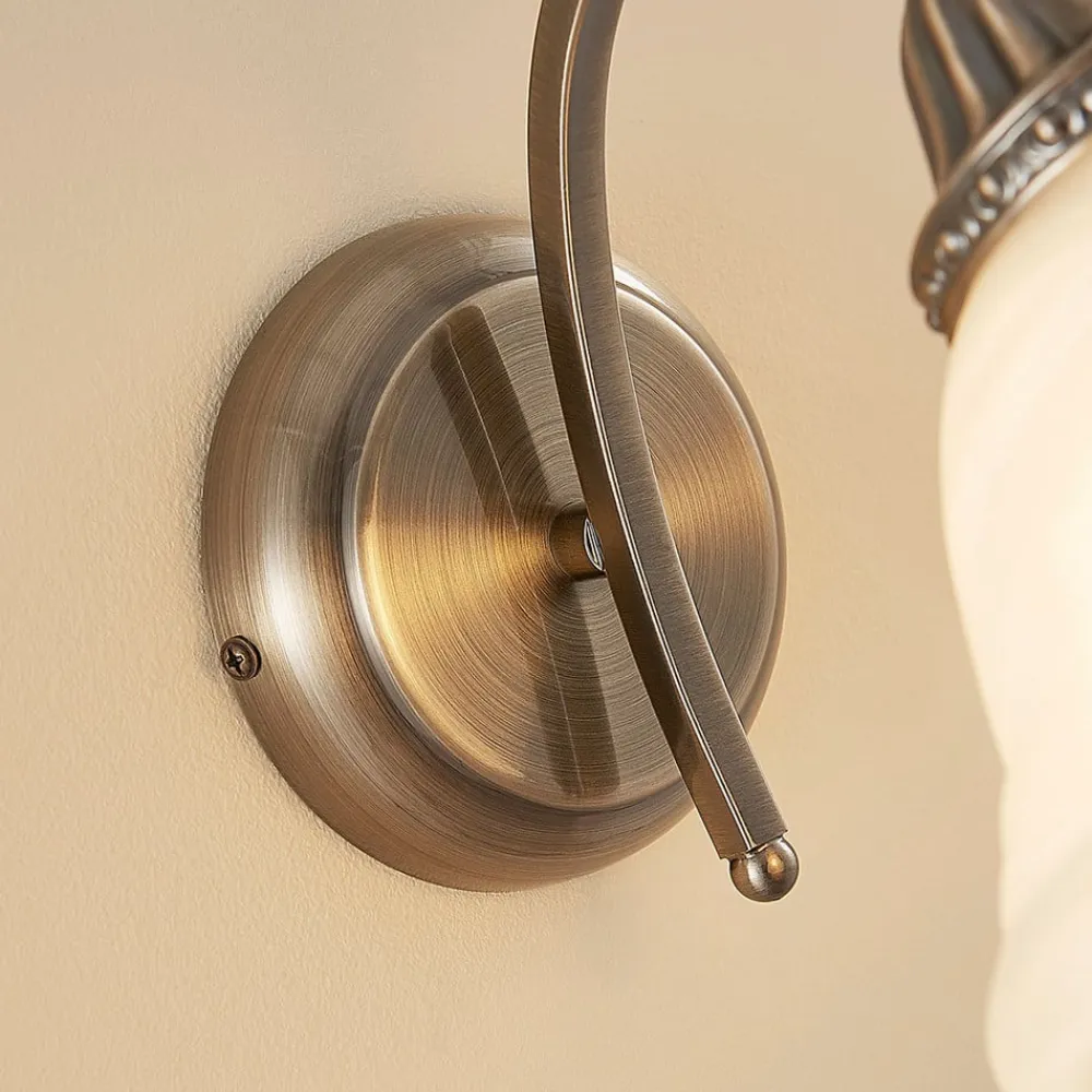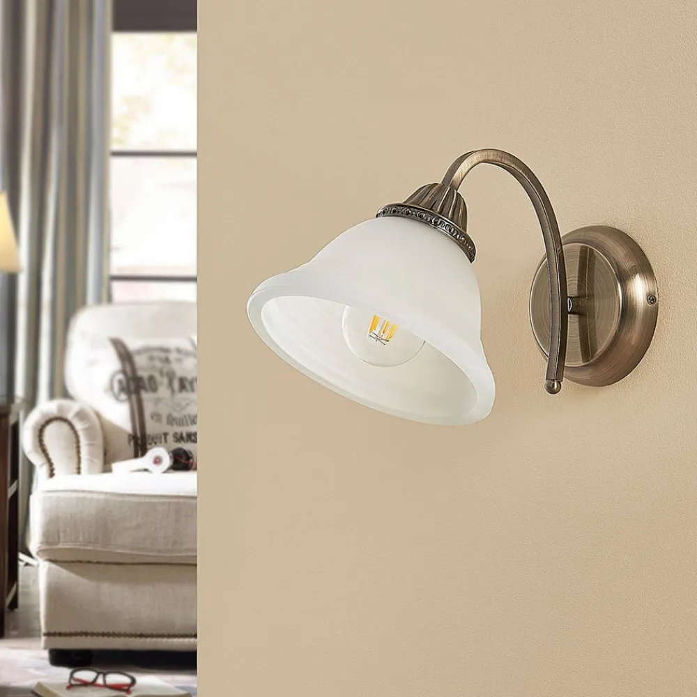 Smuk Mialina-væglampe med antik messingfarvet overflade og skærm i alabast-look Glasskærmen på denne væglampe har et klokkeformet design og er ikke bare satinbehandlet, men har et attraktivt alabast-look. Det betyder, at der kommer fine tåger gennem glasset, hvilket bidrager til en endnu smukkere lyseffekt, som i forvejen er meget hyggelig. Det afhænger selvfølgelig også af valget af lyskilde, som er helt op til forbrugeren, da der findes mange forskellige typer lyskilder på markedet til E27-fatningen, hvor især energibesparende LED-væglamper kan anbefales. Rammen på Mialina-væglampen er smukt buet, så lyset rettes nedad, og har en antik messingfarvet finish, som giver væglampen et særligt klassisk udseende.