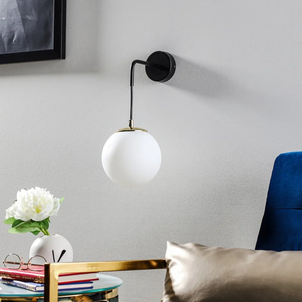 Væglampe Ognis K1 kombinerer moderne design med materialer af høj kvalitet som metal og glas for at skabe en stilfuld atmosfære. Kombinationen af sort og guldfinish giver ethvert rum et elegant touch og gør lampen til et ægte blikfang. Den kugleformede skærm sikrer en jævn lysfordeling og sætter målrettede accenter i stuen, soveværelset eller spisestuen.