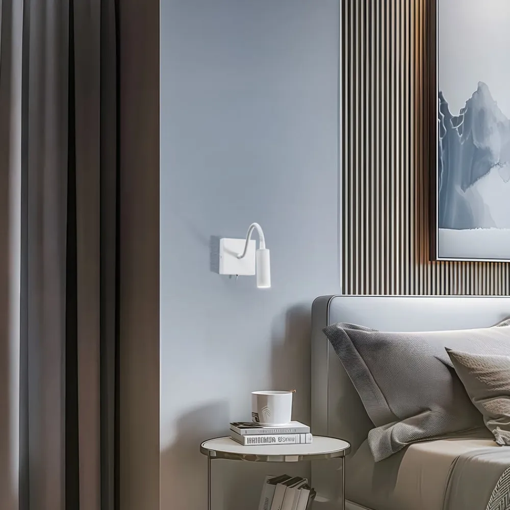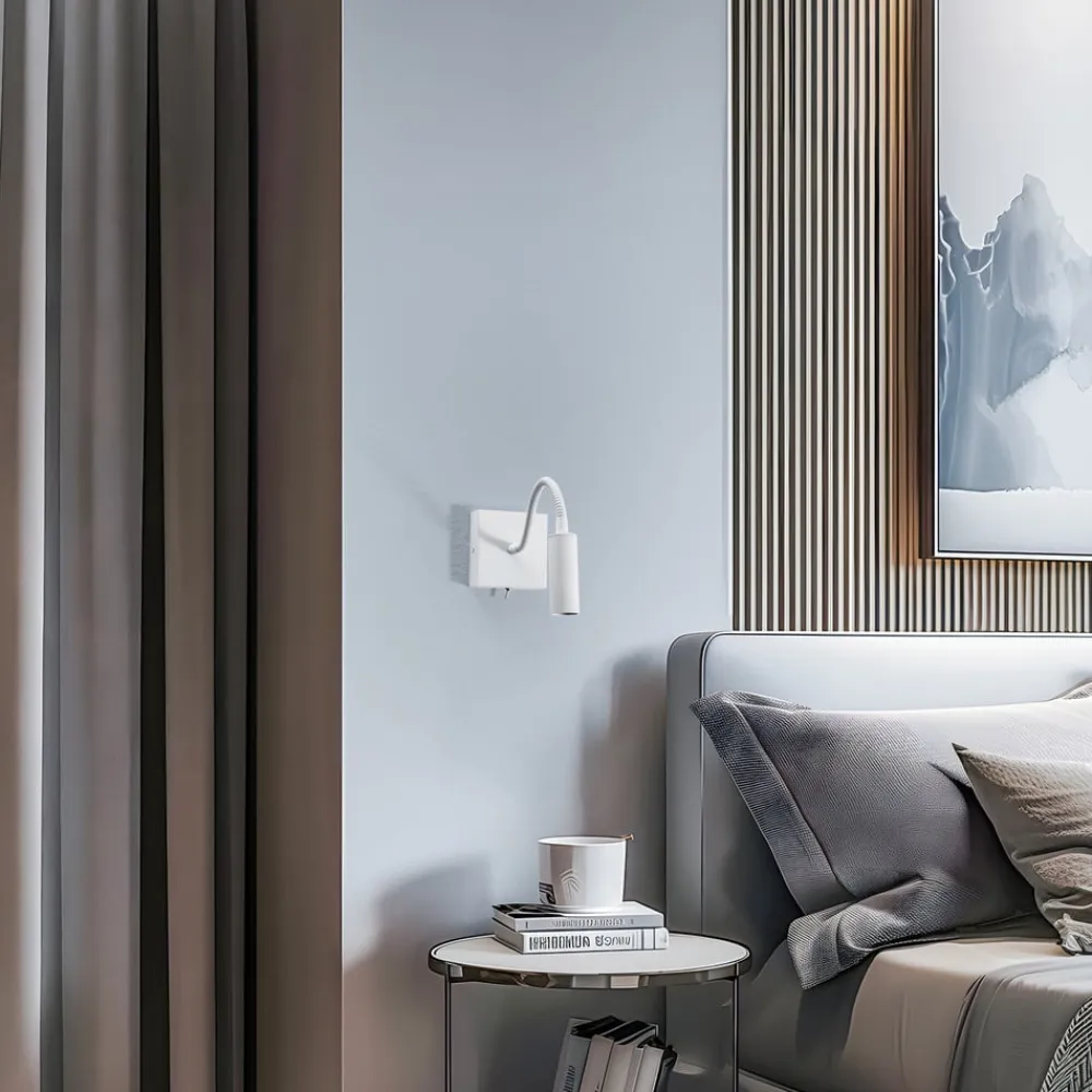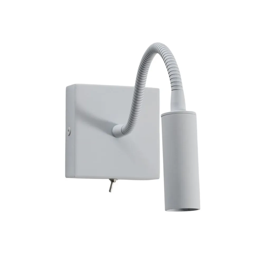 Hvid Ojos væglampe med fleksibel arm – perfekt til læselys Ved siden af sengen eller i læsehjørnet er Ojos væglampen en velkommen og praktisk lyskilde. Det lille, cylindriske hoved har plads til en G9-pære og kan justeres frit takket være den fleksible arm, så Ojos kan bruges som læselampe til at belyse et bestemt område uden at blænde. Væglampen er lavet af stål og har en monokrom hvid finish. Der er en vippekontakt på undersiden af det kantede vægbeslag til betjening. Den er produceret i Europa.