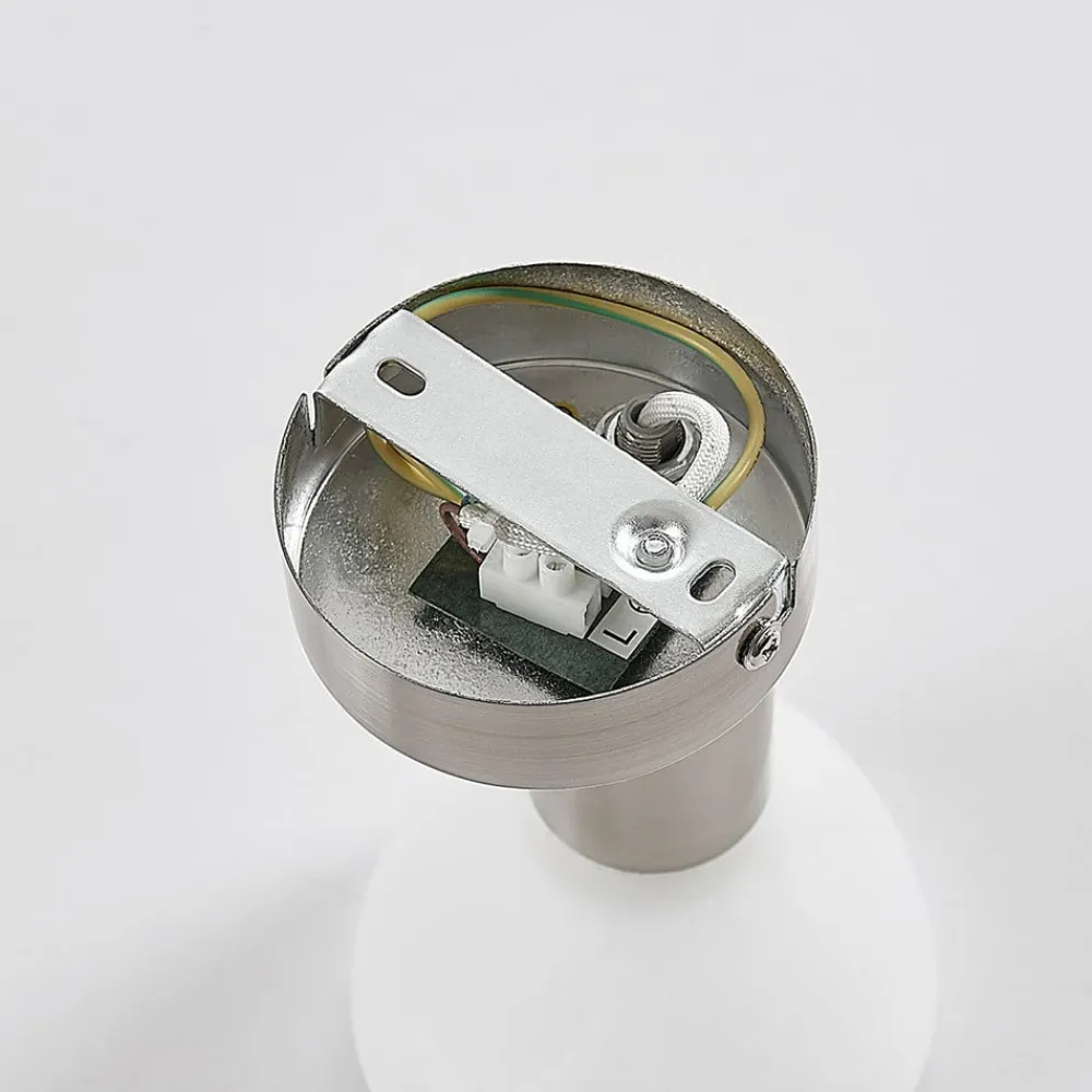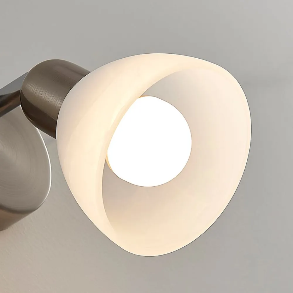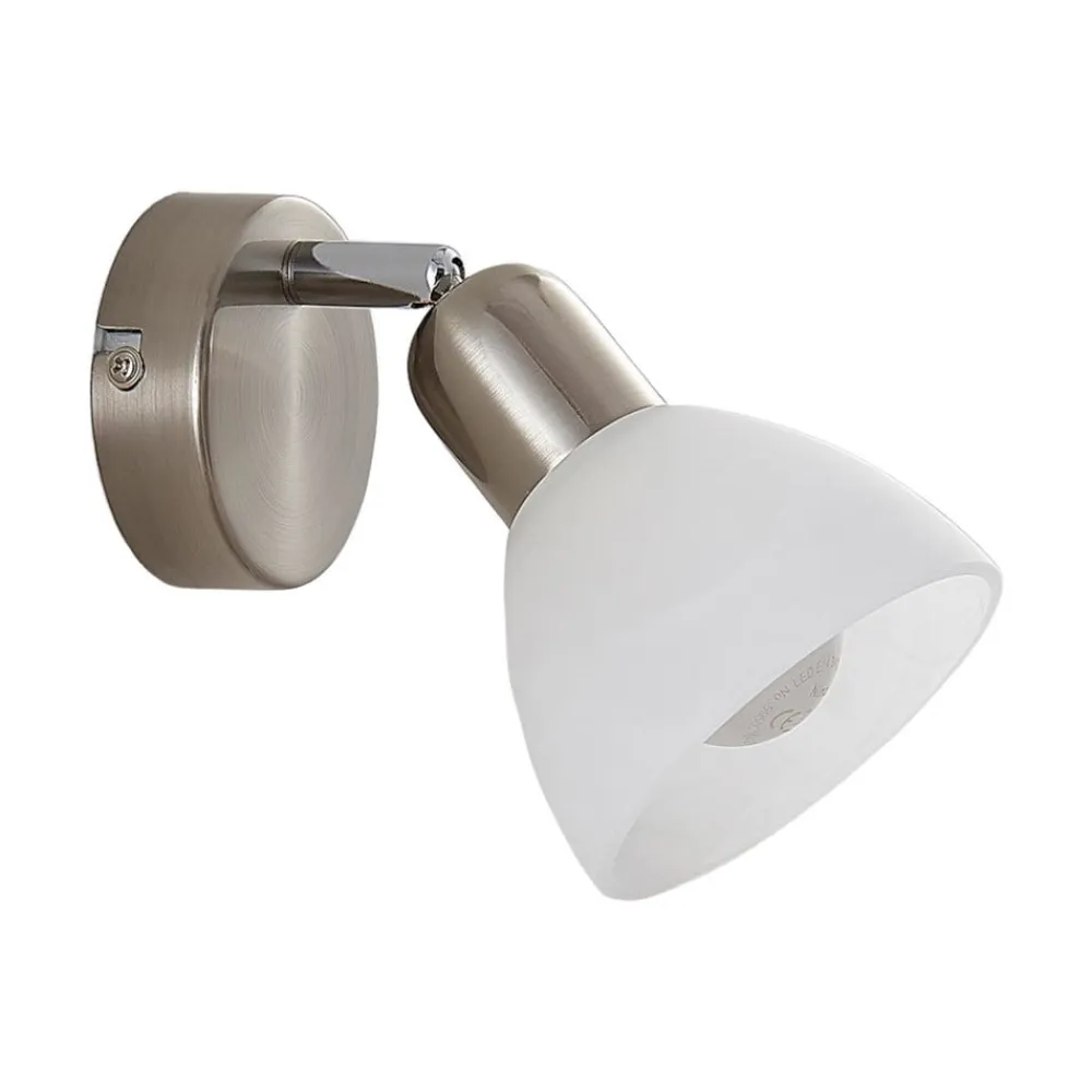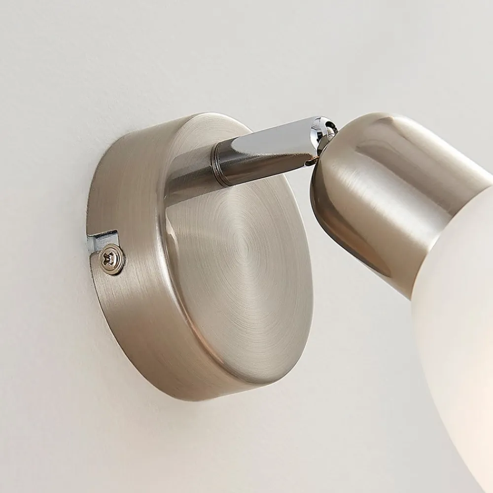 paulina væglampe med elegant glasskærm Paulina er en væglampe, der er designet som en spotlight. Skærmen er forbundet med vægbeslaget via et led, så den kan drejes og svinges. Hvis det er nødvendigt, anbefales det også at montere den i loftet. Den kugleformede hvide skærm har en elegant alabastfarvet nuance, så man kan se blide tågeslør passere gennem glasset. Glasset skaber også en blød lysfordeling og dermed en mere hyggelig atmosfære.