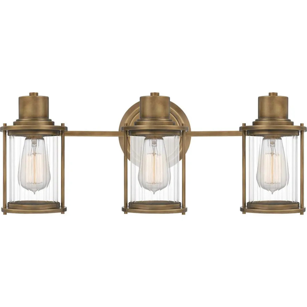 Riggs-væglampe med IP44-beskyttelse, tre lys Riggs-væglampen med tre lys er lavet af stål og har en antik messingfinish. Skærmenes klare glas med et rillet mønster og metaludtagene i bunden fuldender lampens look. Riggs-væglampen monteres over badeværelsesspejlet og giver et behageligt lys på badeværelset, hvor den kan bruges uden problemer takket være IP44-beskyttelsesgraden.