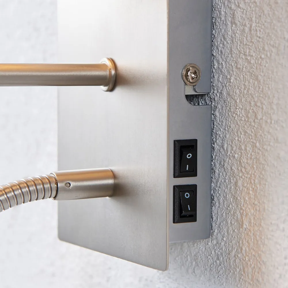 Hvid stofvæglampe Shajan med integreret, fleksibel LED-læselampe Shajan-væglampens udseende domineres af den cylindriske lampeskærm af hvidt stof. Bag den sidder en E27-fatning, som kan udstyres med en lyskilde efter eget valg. Ud over denne lyskilde, som giver et smukt, særligt stemningsfuldt feel-good-lys, er der en fleksibel arm på rammen, som fører til den integrerede LED-læselampe. Takket være flexteknologien kan det lille spotlight justeres uden huller, så lyset skinner præcis, hvor der er brug for det. For ekstra bekvemmelighed er de to kontakter placeret direkte på stellet, og denne funktion gør Shajan ideel som belysningsmulighed til sofaen eller sengen.