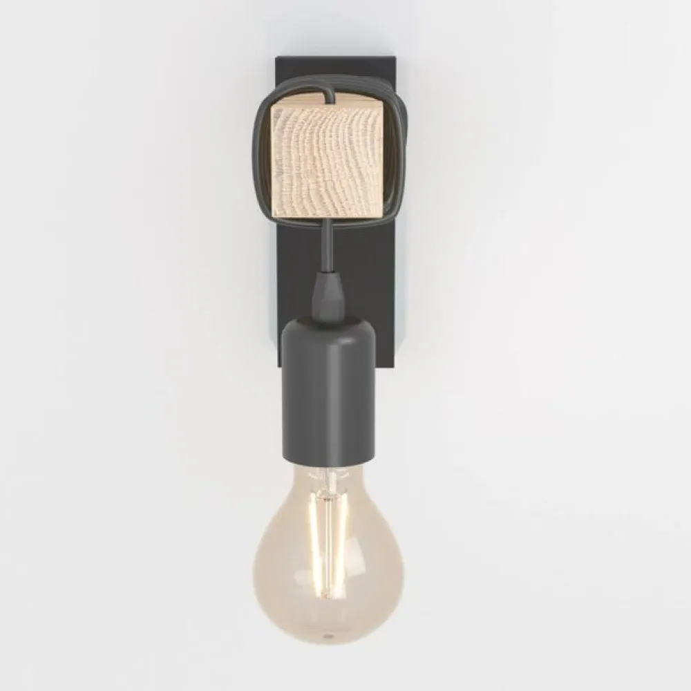 Væglampen monteres med en sort holder på væggen. Vandret stikker en træstump ud i rummet, hvor det ligeledes sorte kabel er viklet rundt om, som pæren hænger i. Naturlighed og industriel charme forener sig der i den formfuldendte lampe, der er ideel at integrere i talrige indretningsstile. Som lyskilde ved siden af sengen kommer lampen her særligt godt til sin ret.