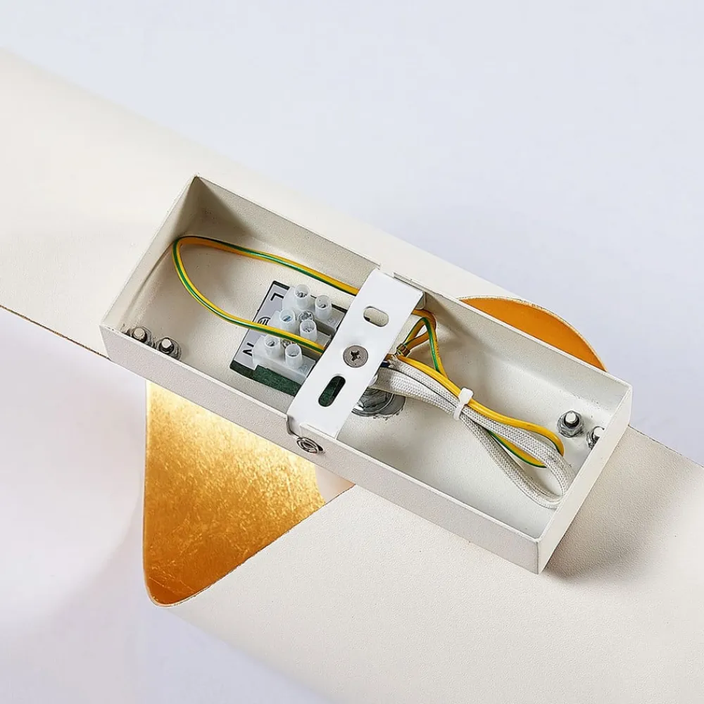 Hvid og guld Vanni væglampe med usædvanligt formet metalskærm – ideel til hyggelig accentbelysning Vanni væglampen består af en rullet metalskærm med et tidløst hvidt ydre, mens indersiden af skærmen er tonet i guld. Det gavner ikke kun det overordnede look, men skaber også en fantastisk lysstemning med et meget hyggeligt udtryk og et fascinerende samspil mellem skygge og lys. Med disse egenskaber er væglampen i metal ideel til stuer eller kan også installeres i et soveværelse eller en gang. Men lampen er et ægte blikfang, selv når den ikke er tændt.