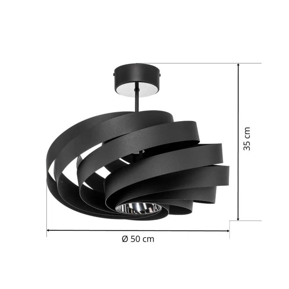Enestående Vento-loftlampe i sort Moderne design, fantastisk belysning og dekorative lysaccenter – det er, hvad Vento-loftlampen står for, med en skærm, der straks fanger øjet, selv når den ikke er tændt. Skærmen består af spiralformede metalstrimler, der skaber en attraktiv effekt, når lyset skinner gennem revnerne mellem metalelementerne. I neutral sort passer Vento godt sammen med mange indretningsfarver.