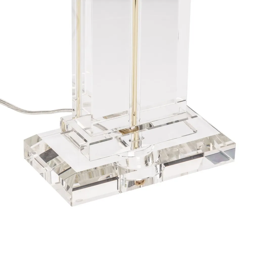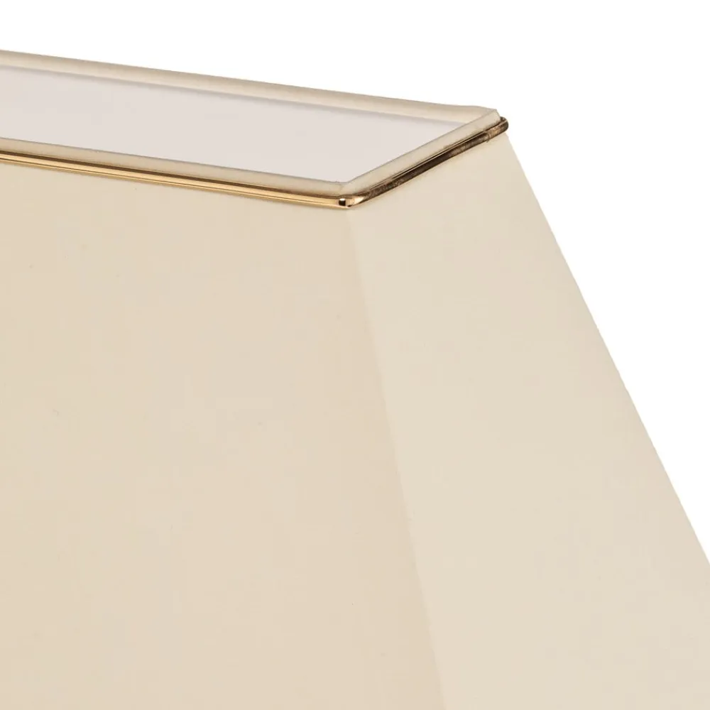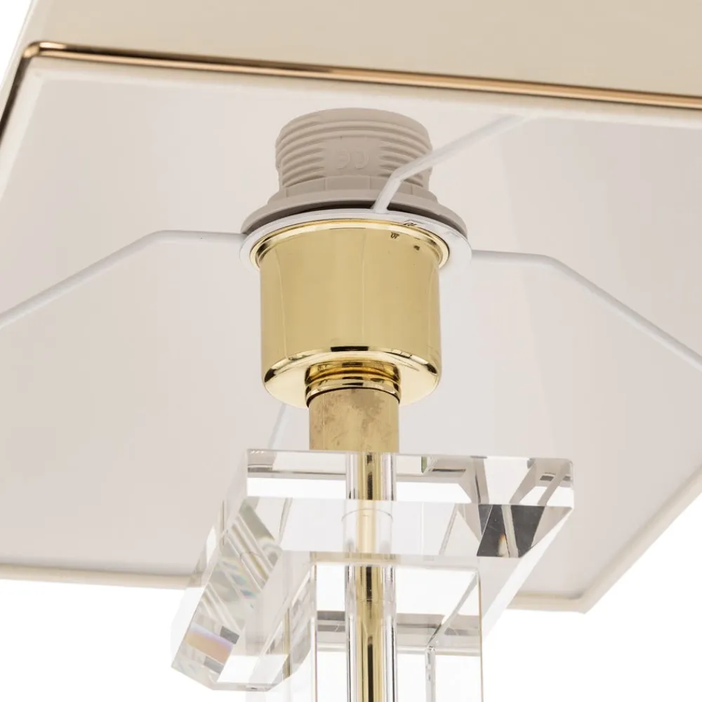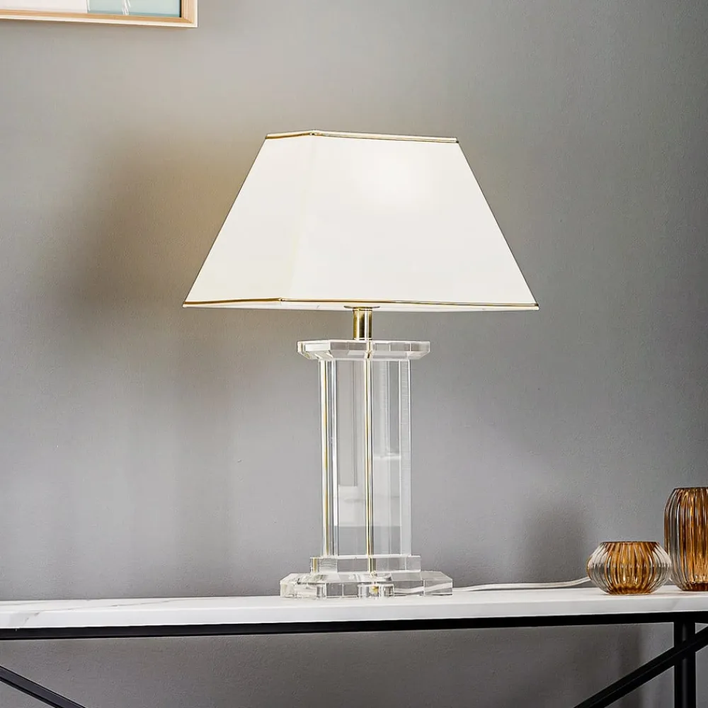 Den cremefarvede Veronique Chintz bordlampe og K9 krystalglas kombineres meget elegant og skaber en speciel iøjnefaldende.Lampens bund ser meget robust ud takket være det brede, kantede K9-krystalglas og minder om en stabil søjle. Tænding af lampen lader endda glasbasen skinne lidt, en særlig flot bivirkning, der ser meget yndefuld ud på grund af det skårne K9-krystalglas. Skyggen er derimod raffineret øverst og nederst med vaffeltynde, gyldne dekorative kanter. Lyset kan let tændes ved hjælp af en kontakt på forsyningsledningen. En varmhvid lyskilde, som frit kan vælges, kan også skabe en hyggelig atmosfære.