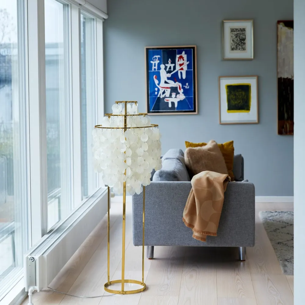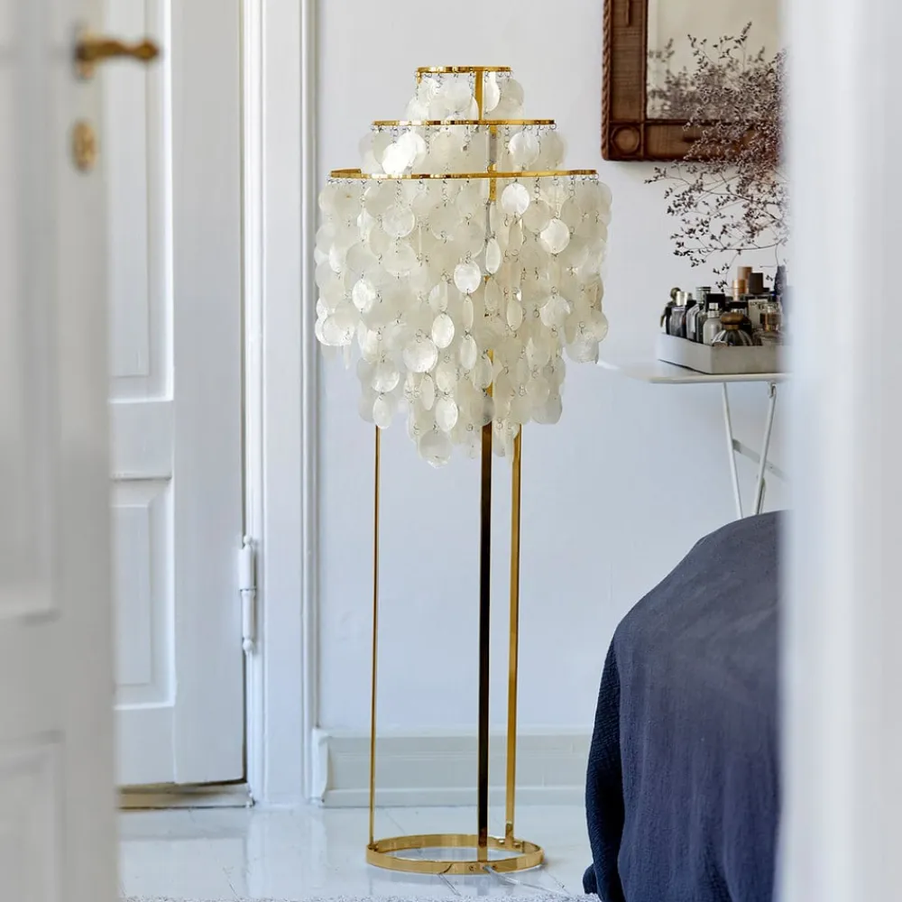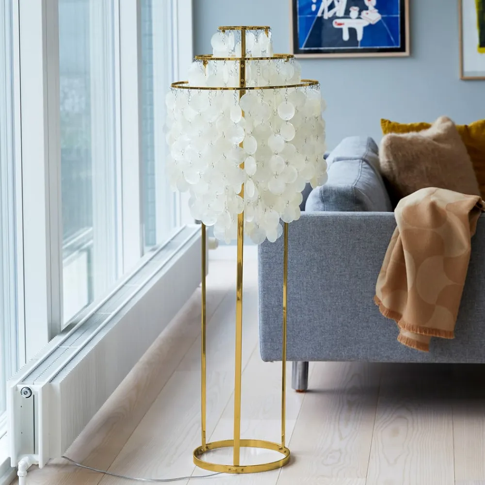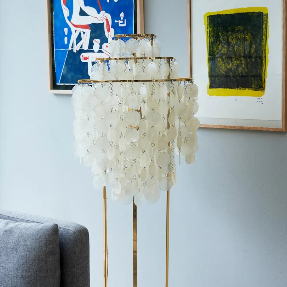 Fun gulvlampe med ekstravagant skærm lavet af muslingeskaller Skærmen på Fun gulvlampen består af en metalramme med tre ringe, hvorfra muslingeskaller, der er forbundet med hinanden med små øskner, hænger ned. Dette giver det optiske indtryk af en kaskade. På den ene side bliver skalleskiverne effektivt iscenesat af det udstrålende lys, og på den anden side skabes der en meget hyggelig ekstra belysning i stuer og soveværelser. fun-serien af lamper anses af mange for at være et mesterværk af den danske designer Verner Panton (1926-1998), hvis arbejde adskilte sig fra andre skandinaviske designere ved at foretrække plast som materiale og bruge hele regnbuens farvespektrum. – Gennemsigtigt kabel med integreret fodkontakt medfølger