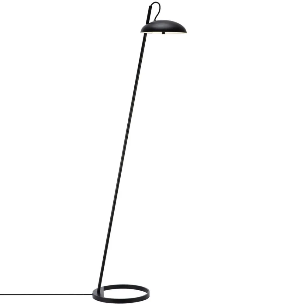 Filigran Versale gulvlampe i minimalistisk skandinavisk stilVersale gulvlampen består af en ringformet base, der er forbundet med det afrundede lampehoved via en smal ramme. Versale er ideel som f.eks. en læselampe eller et stemningsfuldt belysningselement i stuen. Lyset udsendes blændfrit og giver behagelige lysforhold i rummet. For at tilpasse belysningen til de personlige behov kan skærmen vippes opad og nedad.- Design: Anker Studio