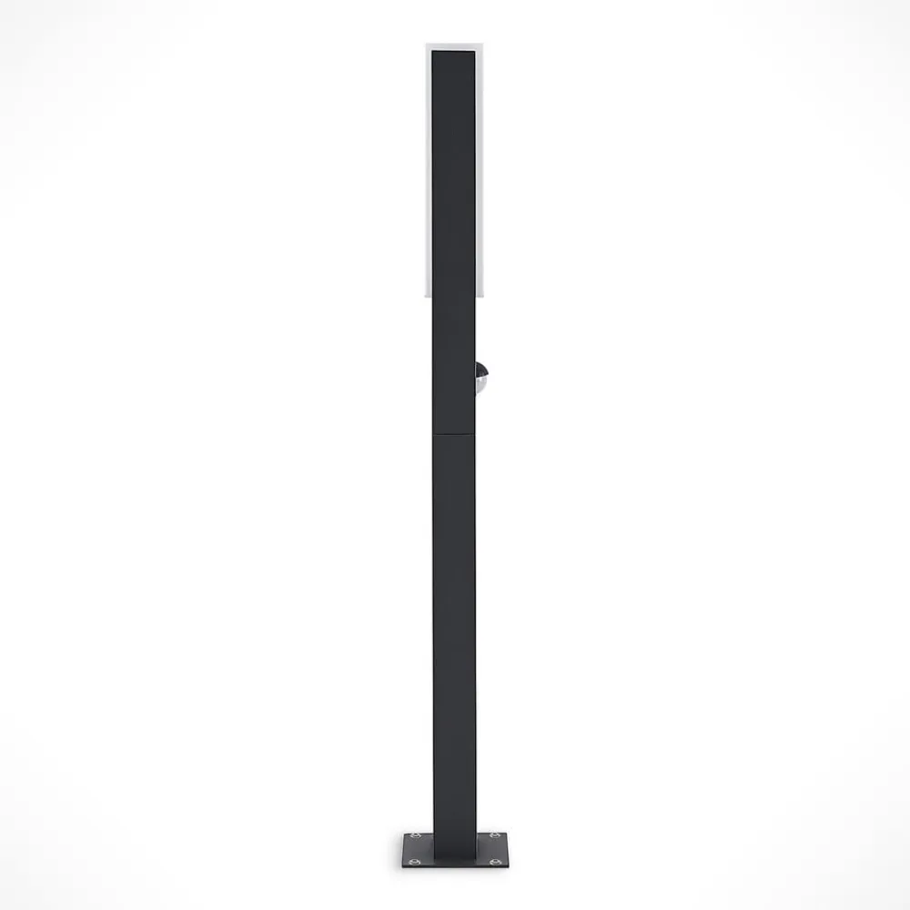 Virgalia LED-gadelampe scorer med sine tekniske funktioner Udstyret med den nyeste teknologi har Virgalia LED-gadelampe et mørkt design, der er meget ligetil og klart defineret. Her kombineres rammens grafitgrå med lampeskærmens opalhvide farve. Armaturet har en indbygget skumringssensor og en bevægelsessensor, der registrerer bevægelse i en radius på op til 10 meter og automatisk tænder det varmhvide LED-lys. Registreringsvinklen er 120°, og brugerne kan selv indstille belysningstiden fra 8 sekunder til 8 minutter.