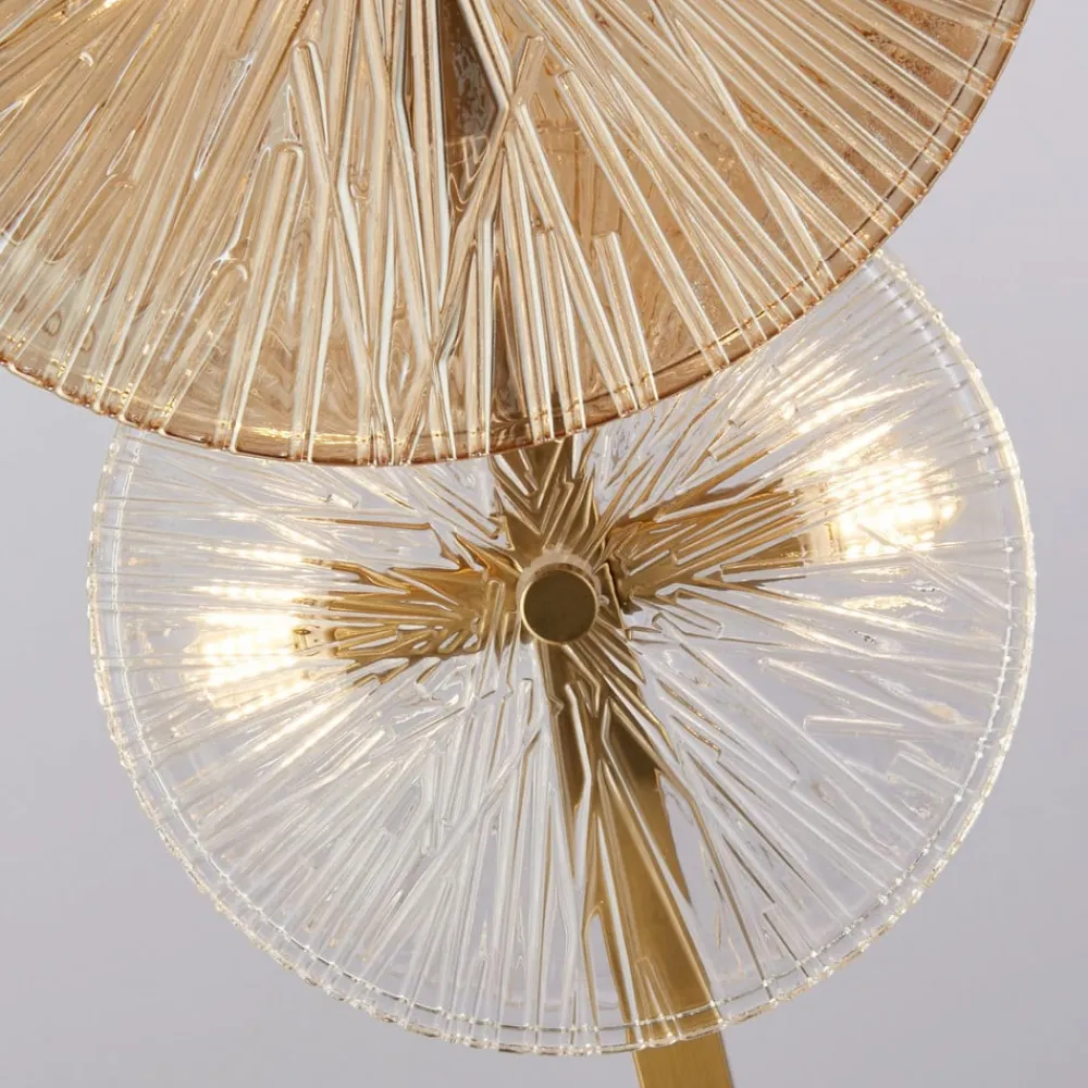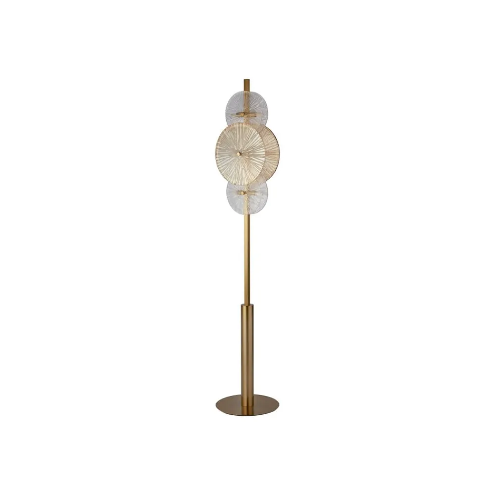 Wagon Wheel-gulvlampe med struktureret glas Wagon Wheel-gulvlampen er et højdepunkt, der ubesværet forbedrer enhver moderne indretning. Med en aura af elegance og raffinement er denne gulvlampe designet til at forbedre ethvert rum. Wagon Wheel har klare og ravfarvede teksturerede glaspaneler, der spreder lyset og skaber fortryllende mønstre i rummet, mens det messingfarvede, lakerede stålstel supplerer det overordnede design på smukkeste vis. Wagon Wheel har plads til seks frit valgbare G9-lamper (se tilbehør). Med fodkontakt (tænd/sluk) på kablet.