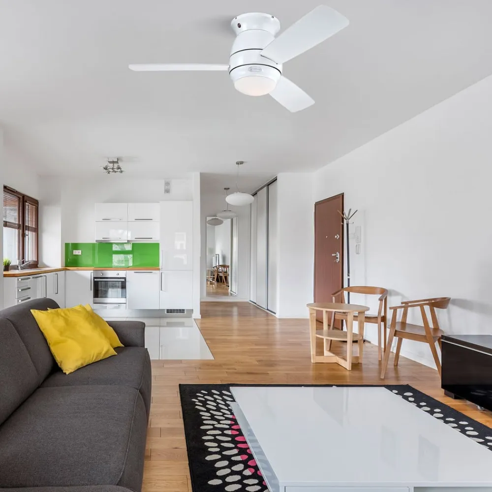 Loftventilatoren Halley, der monteres direkte under loftet, er velegnet til brug i rum op til 20 m². Den sørger ikke kun for en frisk brise, men giver også en passende generel belysning takket være den integrerede lampe. Vingerne kan vendes, de er hvide på den ene side og lyse ahorn på den anden side. Der medfølger fjernbetjening.