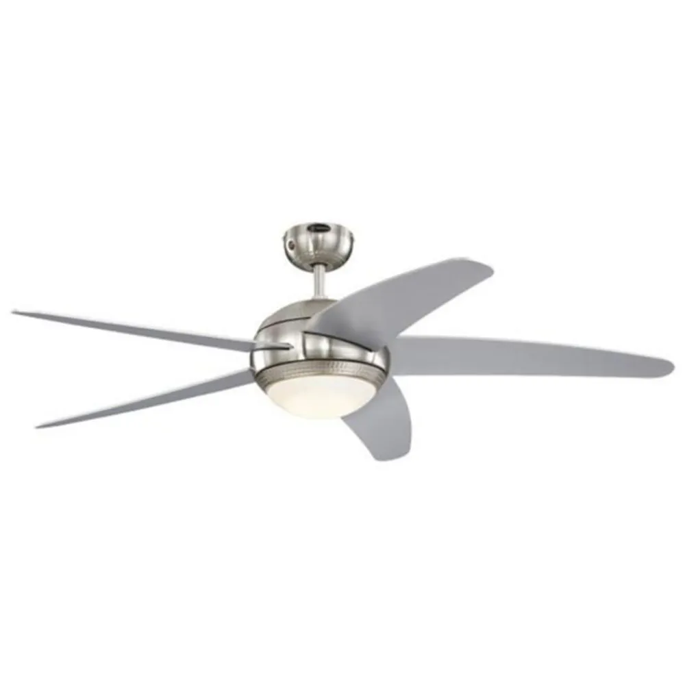 Den moderne loftventilator Bendan har et forkromet hus og sølvfarvede trævinger. Den hamrede dekoration giver et meget attraktivt udseende. Takket være den integrerede LED-lampe kan Bendan også fungere som grundbelysning i stuen. LED-belysningen kan også dæmpes med den medfølgende fjernbetjening. Der kræves AA-batterier til fjernbetjeningen (medfølger ikke, kan bestilles som tilbehør).