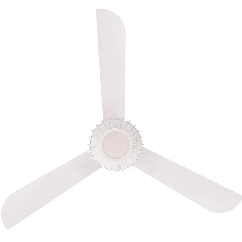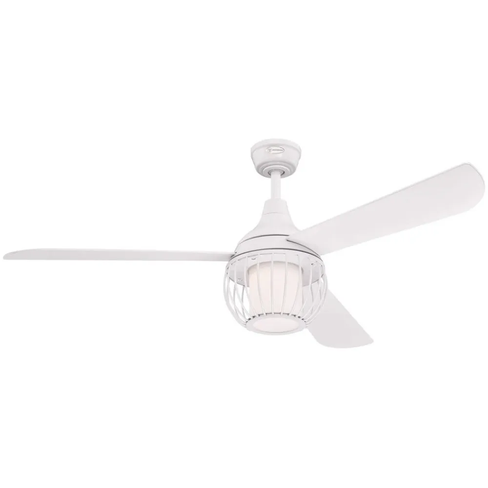Loftventilatoren Graham er en hvid loftventilator, der er udstyret med tre vippelige rotorblade. Den moderne, burformede lampeskærm lægger sig beskyttende rundt om diffusoren, som består af matteret opalglas. Dermed leverer LED’en et varmhvidt, dæmpet lys.