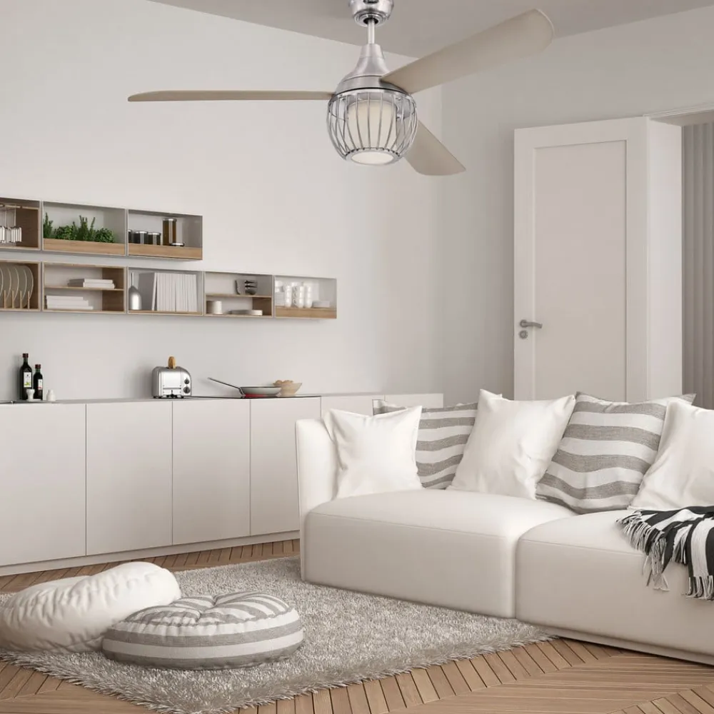 Graham-loftventilator med burskærm og dæmpbart LED-lys Graham-loftventilatoren er en hvid loftventilator med tre drejelige rotorblade. Den moderne, burformede lampeskærm omslutter diffusoren af matteret opalglas. LED’en giver et varmt hvidt, dæmpet lys. Funktion: Ventilatoren startes og stoppes med den medfølgende fjernbetjening. Der kan indstilles 3 hastigheder og 3 watt, og det er muligt at skifte mellem sommer- og vinterfunktion. Fjernbetjeningen kan også bruges til at tænde og slukke for lyset og dæmpe det. Tekniske data: Effekt pr. hastighed: – 54 watt ved 204 o/min – 29 watt ved 146 o/min – 16 watt ved 101 o/min – Luftgennemstrømning: maks. 134,5 m³/min