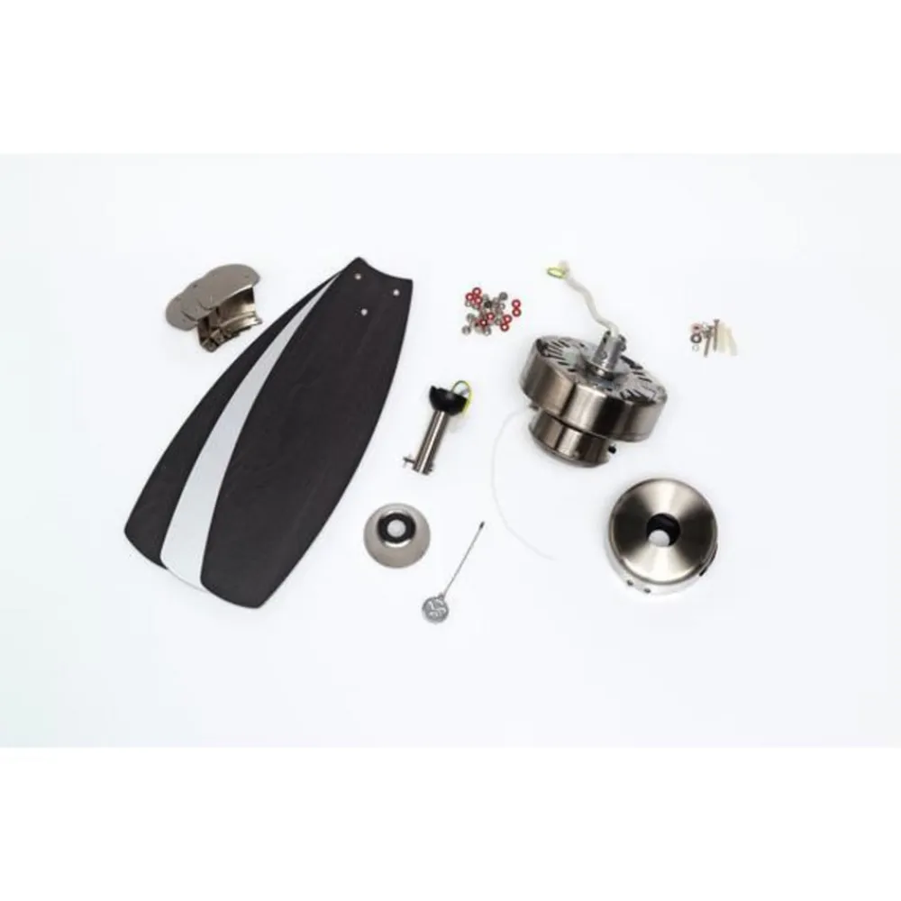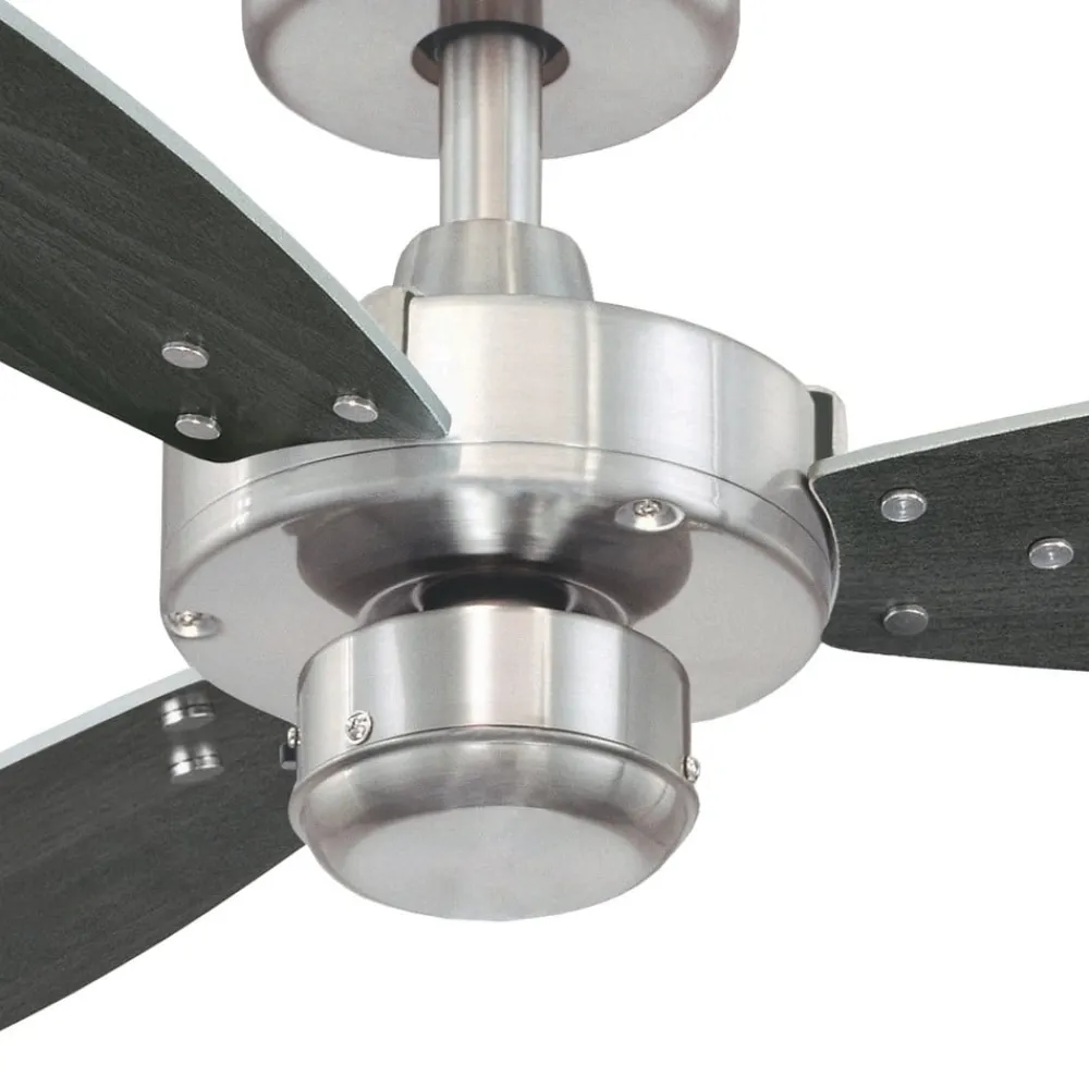 Loftventilatoren Jet I i børstet nikkel og med udskiftelige vinger i wenge- og sølvfarve, diameter 105 cm