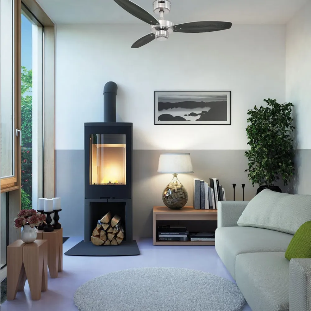 Bemærk: Denne loftventilator kan rotere både med og mod uret (dette kan indstilles vha. en skydekontakt på kabinettet) og er således egnet til brug om sommeren og om vinteren. Den sparer nemlig op til 30 % af varmeudgifterne om vinteren og sørger for en frisk brise om sommeren.