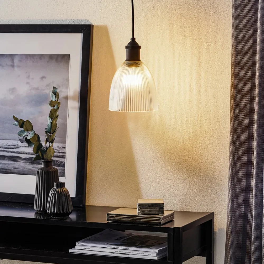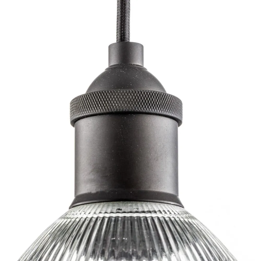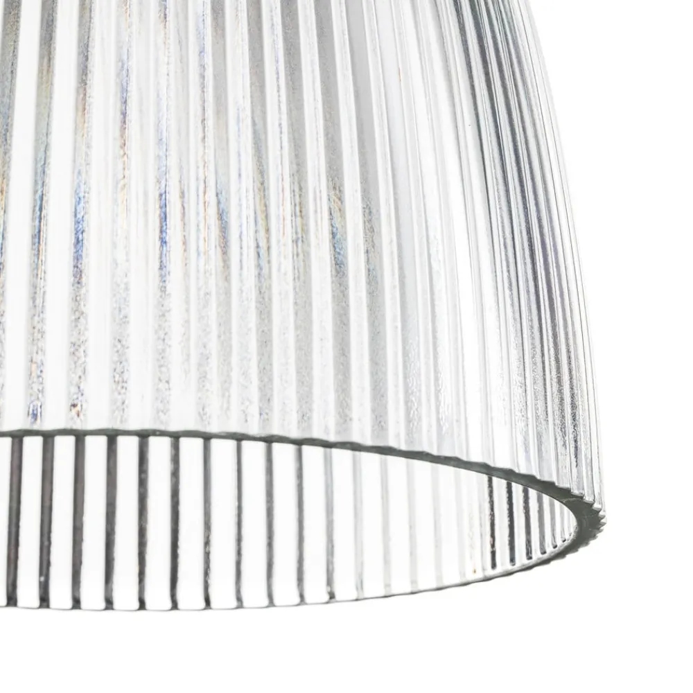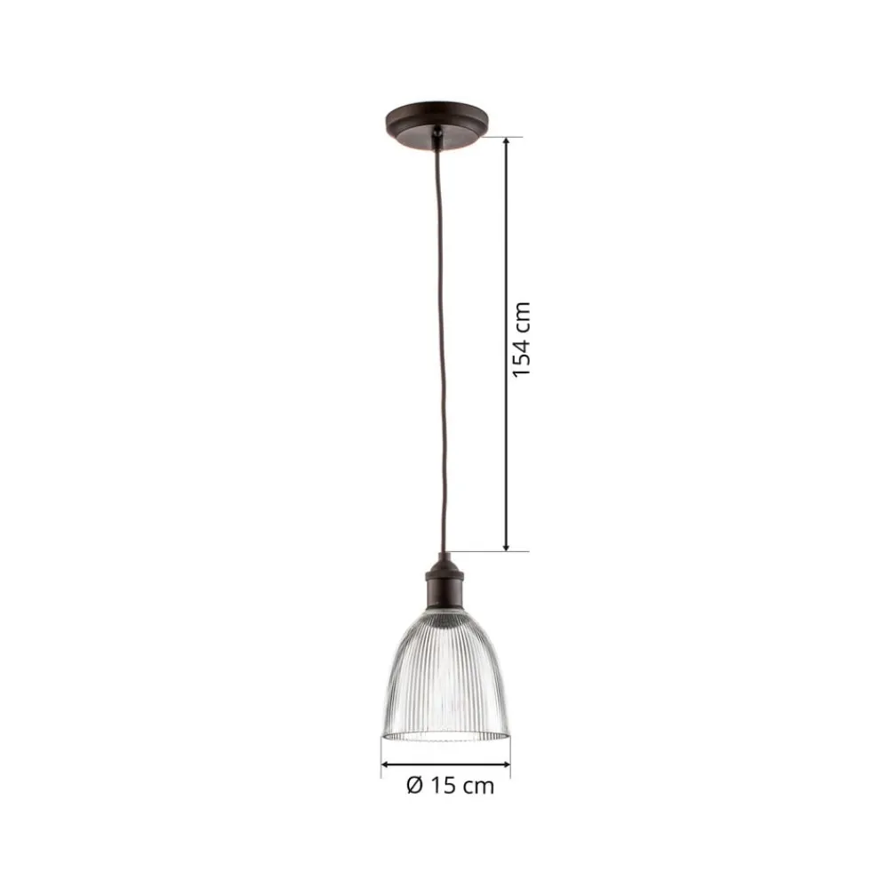 Takket være glasskærmen får denne lampe et rustikt præg. Skærmen har lodrette riller. Disse sikrer, at denne ikke er gennemsigtig, men lettere meleret. Af denne grund er lyset ikke påtrængende, men snarere dæmpet. Det mørke ophæng ser næsten sort ud, men hvis du ser nøje, kan du se den bronzefarvede undertone.