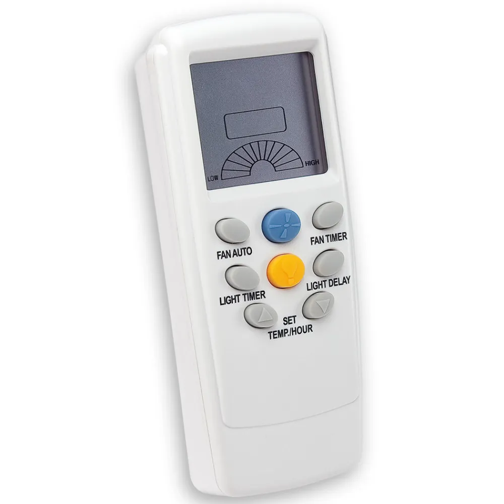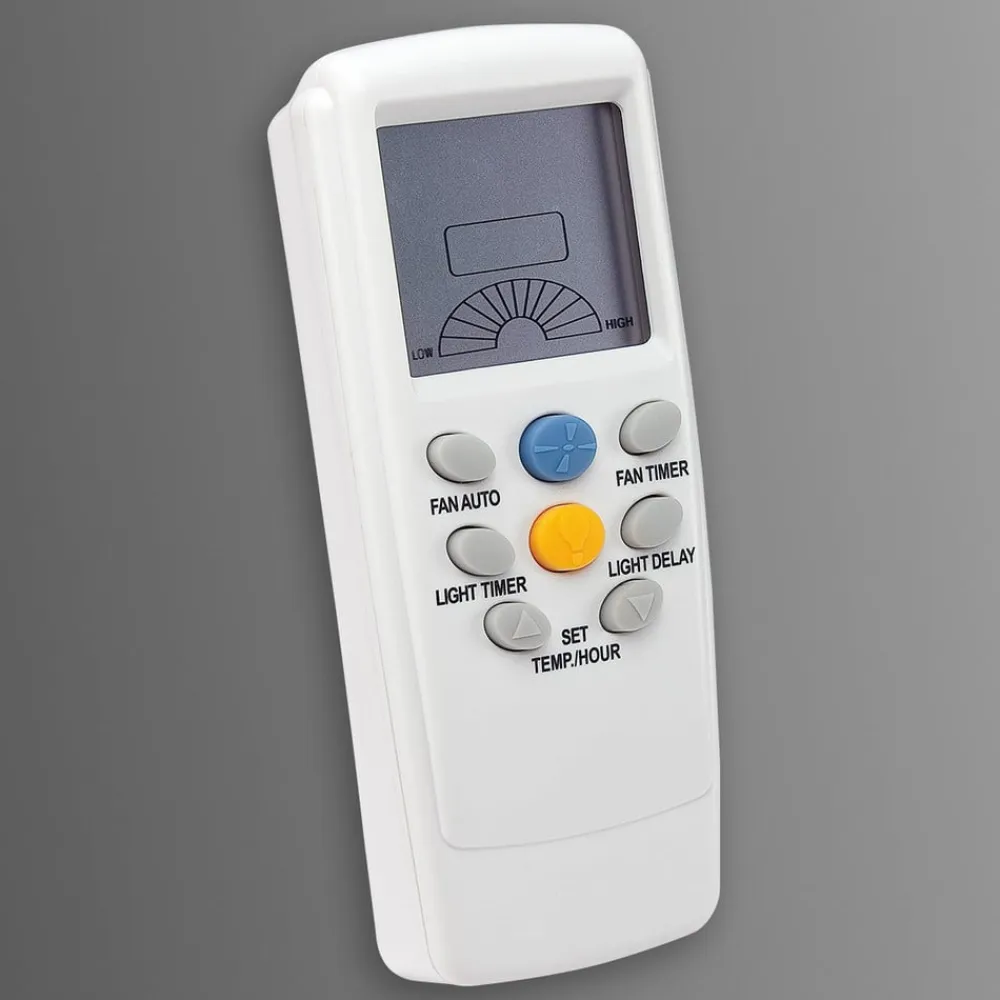 Nem styring af loftsventilatorer med radiofrekvensfjernbetjeningenBemærk: Når du vælger en fjernbetjening, skal du sikre dig, hvilke fjernbetjeninger der er gemt som enhedskompatible i tilbehøret til den købte ventilator. Denne fjernbetjening er praktisk udstyret og kan bruges til at styre Westinghouse ventilatormodeller (undtagen Hugger). Den har en tænd/sluk-knap, der kan betjenes i tre hastigheder, samt en lyskontakt (uden dæmpningsfunktion) og er udstyret med et LCD-display. Der medfølger et vægbeslag, så fjernbetjeningen altid er lige ved hånden, når der er brug for den. Batterier (4 x 1,5 V AAA) medfølger ikke – fås via tilbehør). Den nødvendige modtagerdel, som skal eftermonteres til hver ventilator, er også inkluderet i leveringen. Et vilkårligt antal ventilatorer kan styres sammen, forudsat at de er inden for rækkevidde, og der er indstillet en ensartet frekvens.