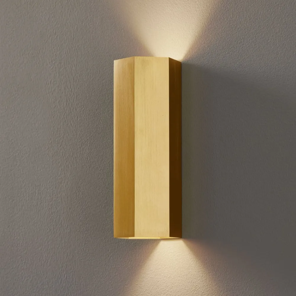 To-lampet væglampe Hexo mini 2.0 – guldfarvet Væglampen Hexo mini 2.0 stråler ikke kun med sit guldfarvede design, men skiller sig også ud med sin sekskantede form, som den har fået sit navn efter. Der er installeret to GU10-fatninger i det slanke armatur, som kan rumme alle lyskilder med en GU10-sokkel. Her anbefales energibesparende LED-lyskilder. Hexo mini udsender sit lys direkte nedad og indirekte opad, hvilket ikke kun giver en passende belysning af omgivelserne, men også skaber en hyggelig atmosfære i rummet.