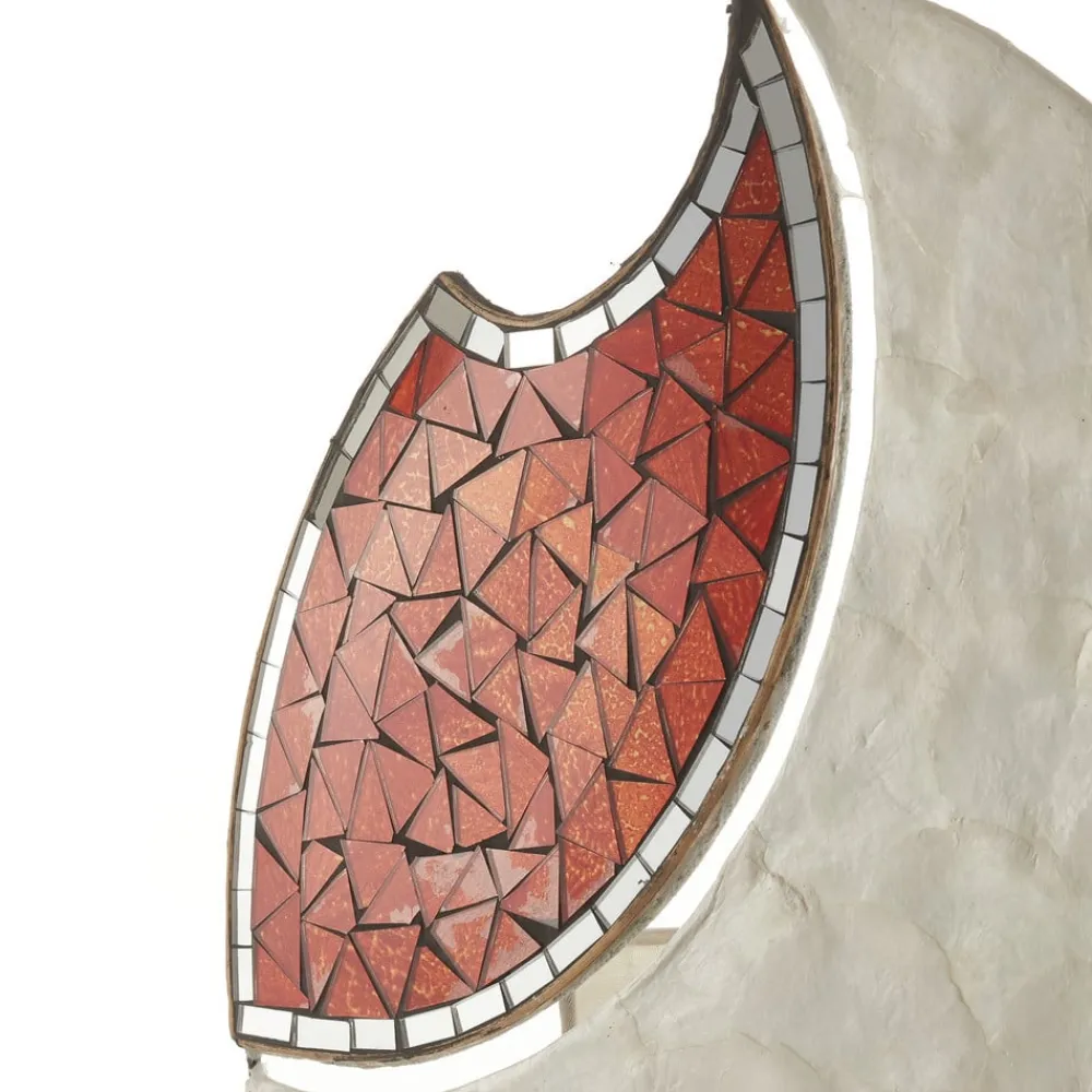 Dekoreret YOKO bordlampe med mosaik YOKO bordlampen er et harmonisk blikfang i perlemorsfarvede og røde toner. Dens ovale skærm er dekoreret med Capis-skiver (perleskaller), glasmosaik og en tynd kontur af spejlglas. Et blødt, indirekte lys spotlightes gennem den, så intet står i vejen for en hyggelig atmosfære.