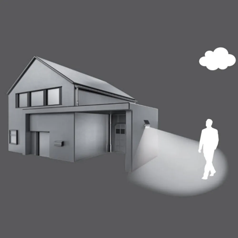 Lampen er lavet af UV-bestandig plast og designet i moderigtig antracit og giver lys 365 dage om året, da den er udstyret med et højeffektivt monokrystallinsk panel og et kraftigt lithium-ferrum-batteri, der giver en energireserve på 50 dage. Den integrerede sensor med Fresnel-linse sikrer også behovsbaseret og frem for alt sikker belysning om natten, da den tænder lyset automatisk, når PIR-sensoren registrerer en person, der nærmer sig. Tekniske data – Solpanel: Monokrystallinsk under glas – Batteri: Lithium-ferrum-batteri (2.500 mAh) – Sensor: Passiv infrarød – Registreringsvinkel: 140° – Rækkevidde: maks. 8 m (ved en monteringshøjde på 1,8 m) – Skumringsindstilling: 2 lux – Tidsindstilling: softwarestyret, 10-30 sekunder – Grundlysfunktion: 3 % hele natten (ekstraudstyr) – Solpanelets drejeområde: +/- 165°, kan fjernes fra lampen – LED-panelets drejeområde: +/- 60° – Kapslingsgrad: IP44 – Inkl. kompas til ideel justering af panelet. Inkl. kompas til ideel justering af panelet – Inkl. 6 meter forlængerkabel – Belysning op til 30 m²